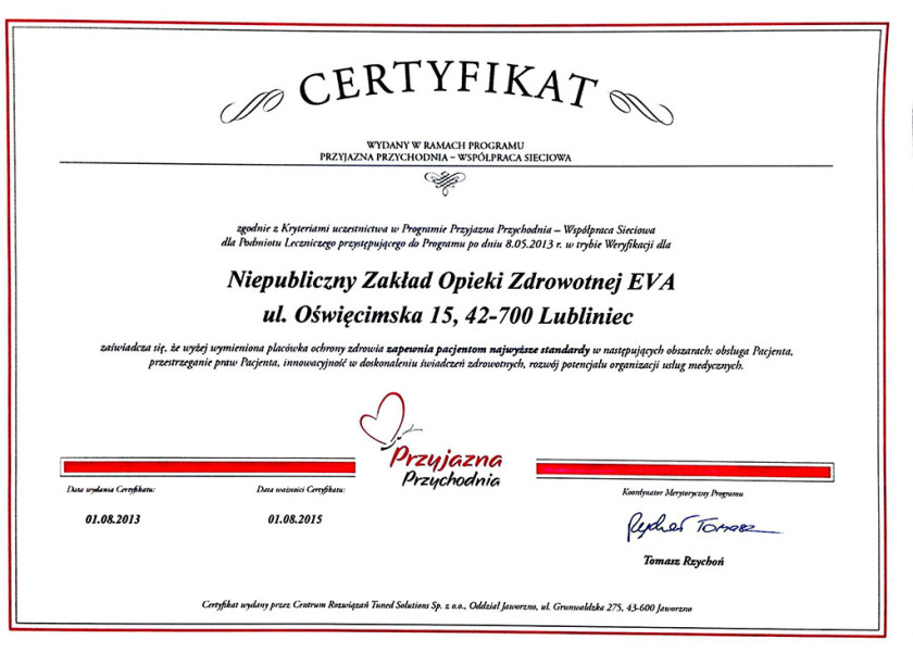 Nasza Placówka została uhonorowana godłem i certyfikatem "Przyjazna Przychodnia", który jest gwarancją najwyższej jakości obsługi pacjenta. Otrzymują je jednostki, które robią dla pacjentów dużo więcej, niż nakazują powszechne normy i przepisy. Realizujemy postulat - "pacjent jest najważniejszy" poprzez stałe inwestowanie w podnoszenie jakości usług medycznych.